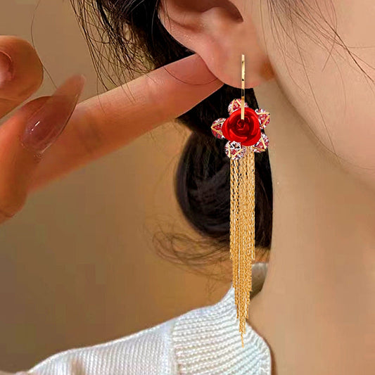 14K Gold-Plated Flower Red Heart Bead Jacket Earrings