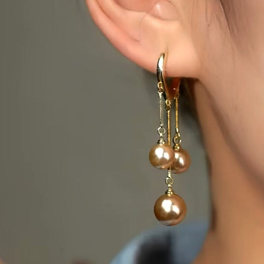 14K Gold-Plated Luxury Three Champagne Gold Pearl Tassel Earrings