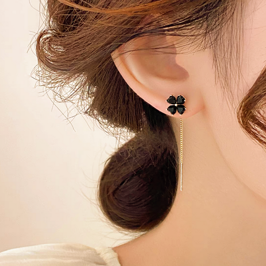 14K Gold-Plated Black Four-Leaf Clover Tassel Threader Earrings
