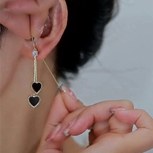14K Gold-Plated Black Heart Tassel Threader Earrings