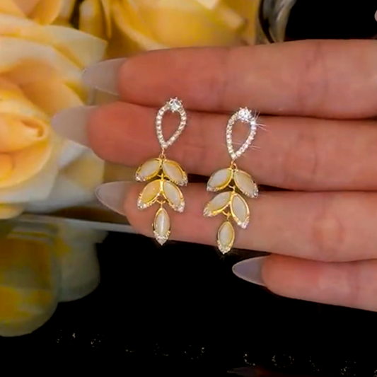 14K Gold-Plated Zircon Diamond Leaf Pearl Earrings