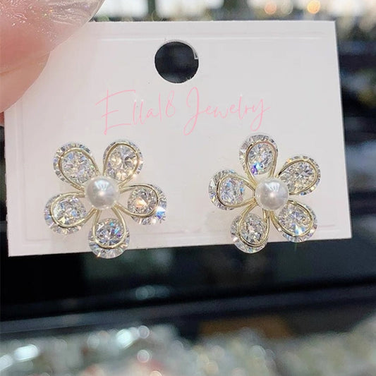 14K Gold-Plated Zircon Flower Pearl Earrings