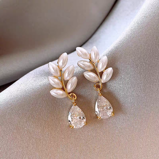 14K Gold-plated Zircon Leaf Pearl Earrings