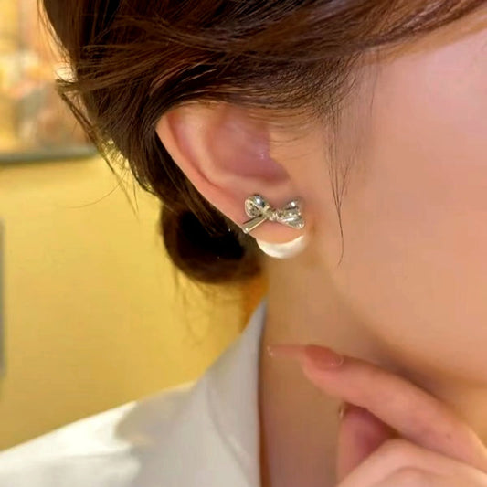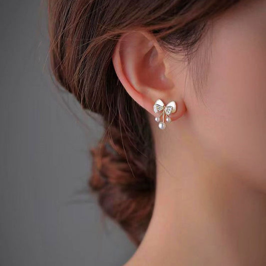 14K Gold-Plated Bow Small Pearl And Diamond Stud Earrings