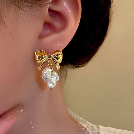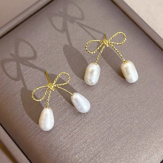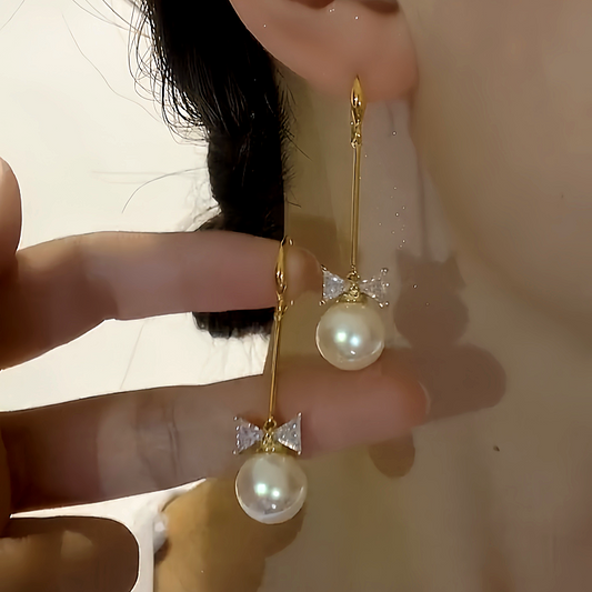 14K Gold-plated Bow Long Pearl Ear Hook Earrings