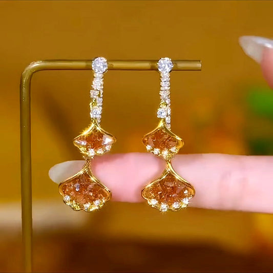 14K Gold-Plated Brown Crystal Ginkgo Leaf Earrings