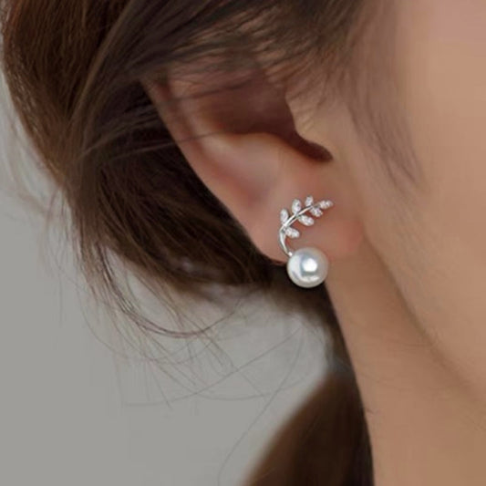 Sterling Silver Diamond Leaf Pearl Stud Earrings