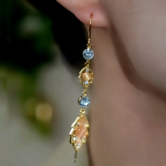 14K Gold-Plated Brown Zircon Double Jade Leaf Threader Tassel Earrings