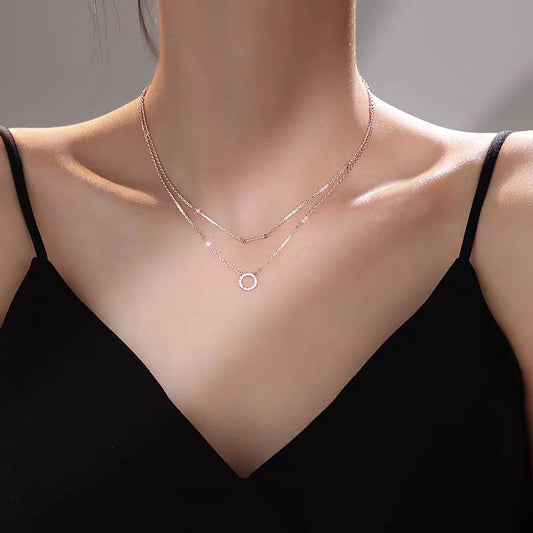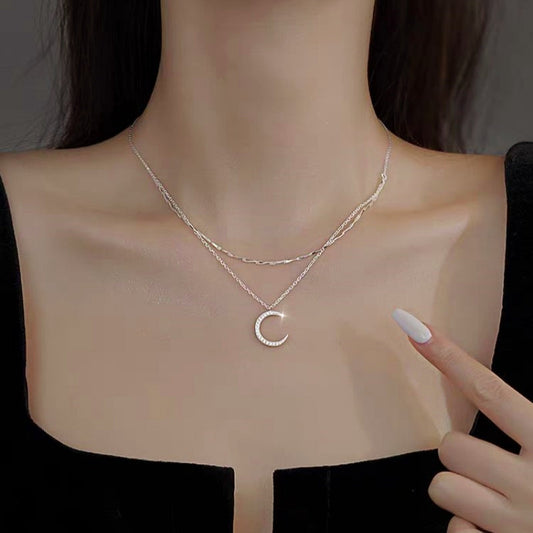 Sterling Silver Double-Layer Diamond Bling Moon Necklaces