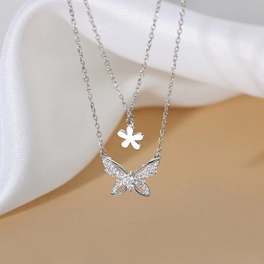 Sterling Silver Double-Layer Zircon Butterfly And Flower Necklaces