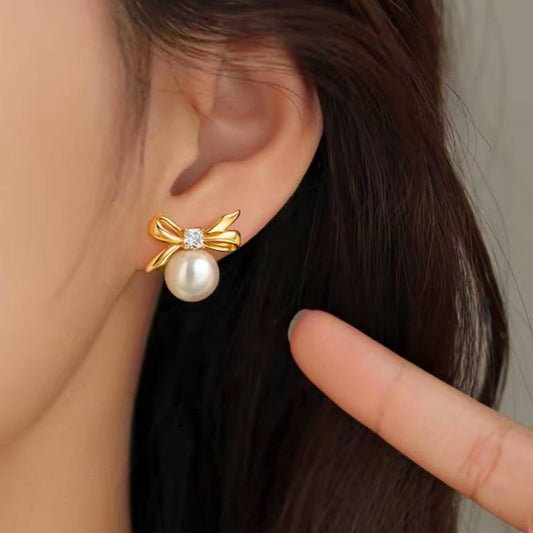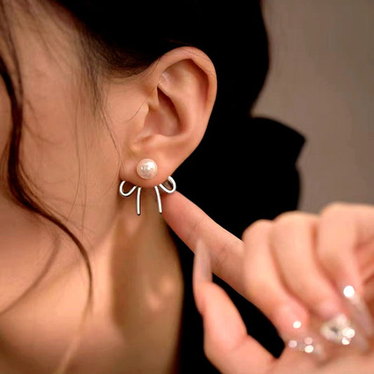 Sterling Silver Elegant Pearl And Bow Stud Earrings
