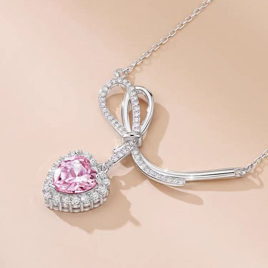 Sterling Silver Pink Zircon Heart-Design Bow Necklaces