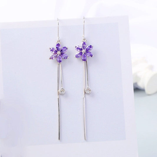 Sterling Silver Purple Zircon Flower Tassel Threader Earrings