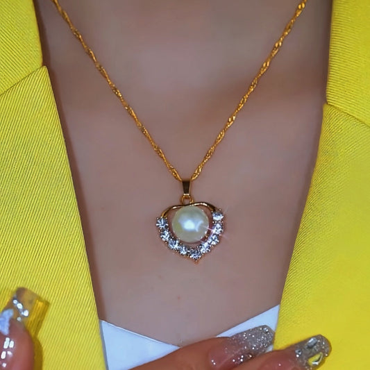 Sterling Silver Zircon Heart-Design Pearl Chain Necklace