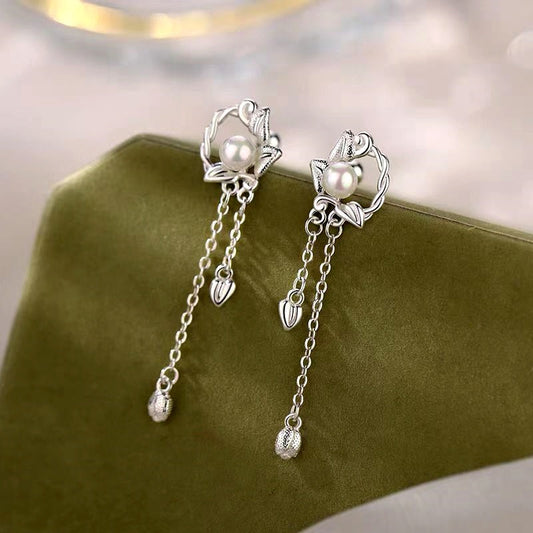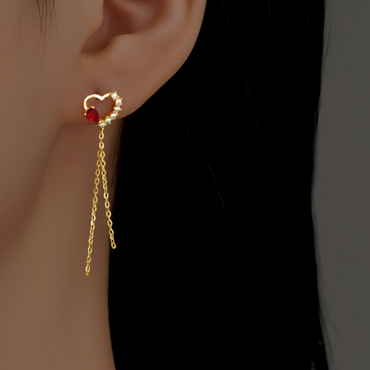 Sterling Silver Zircon Red Diamond Heart Tassel Earrings