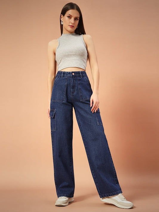 Women Non-Stretch Straight Fit High Rise Dark Blue Cargo Jeans