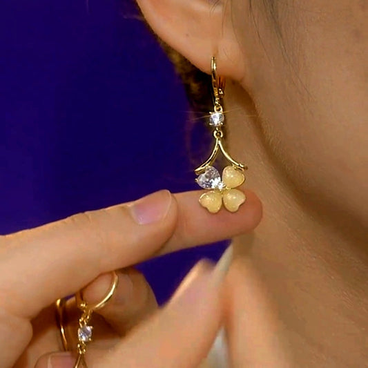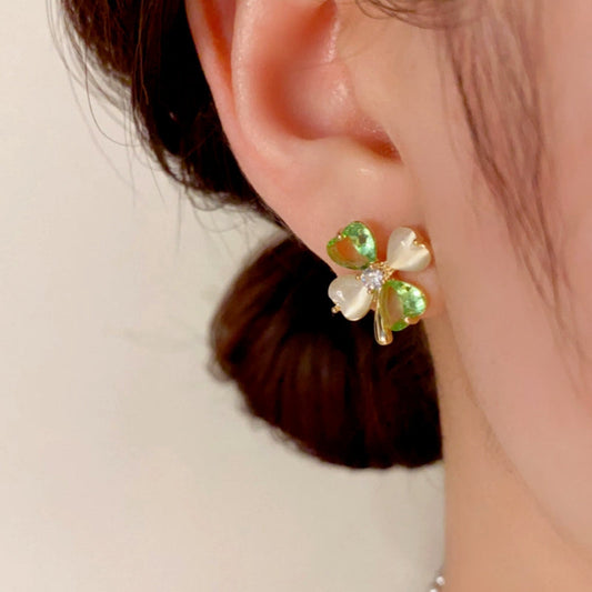 14K Gold-Plated Cat's Eye Green Four-Leaf Flower Earrings
