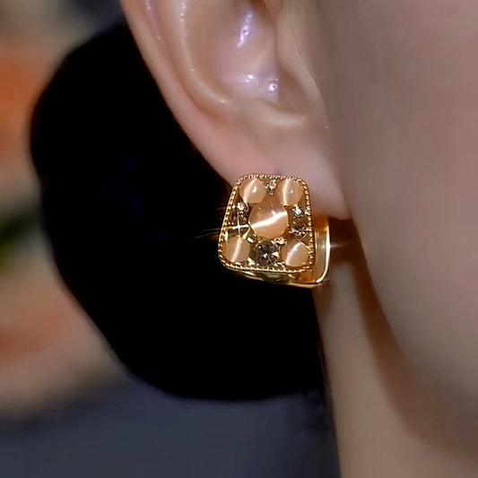 14K Gold-Plated Cat's Eye Stone Zircon Diamond Stud Earrings