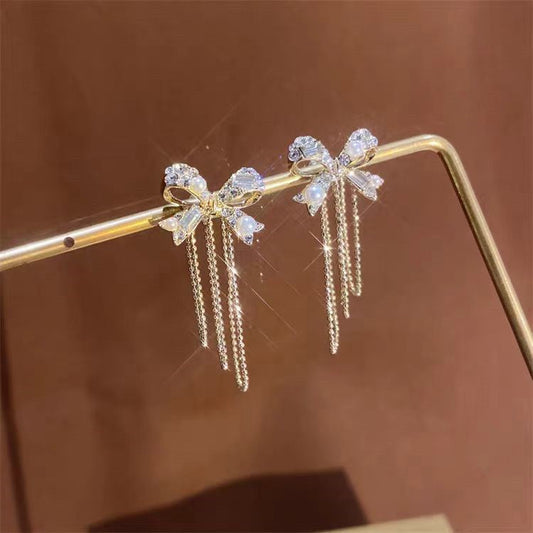 14K Gold-Plated Diamond Bow Bead Tassel Earrings