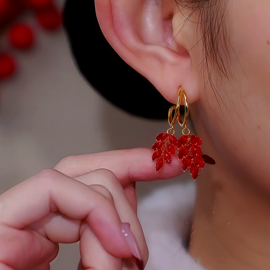 14K Gold Plated Red Diamond Zircon Leaf Earrings