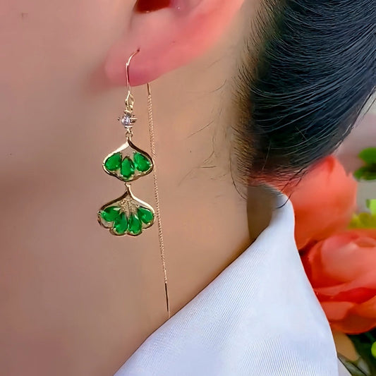 14K Gold-Plated Diamond-Studded Black Oil-Drop Heart Tassel Ear Hook Earrings