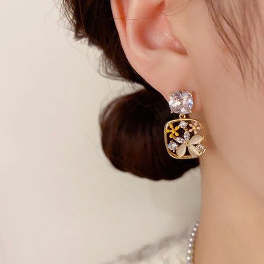 14K Gold-Plated Elegant Cat's Eye stone Flower Square Earrings