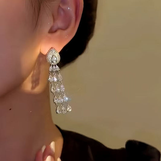 14K Gold-Plated Elegant Diamond Zircon Tassel Drop Earrings