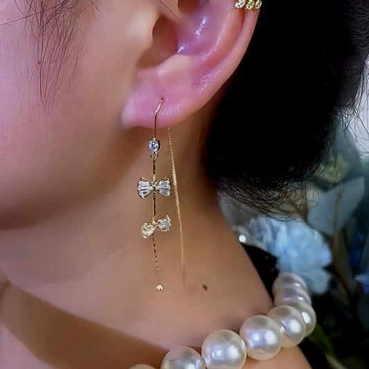 14K Gold-Plated Elegant Double Bow Tassel Threader Earrings