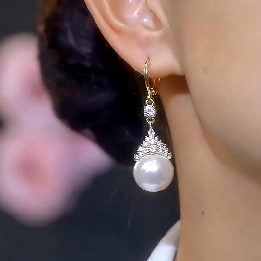 14K Gold-Plated Elegant White Pearl Zircon Crown Earrings