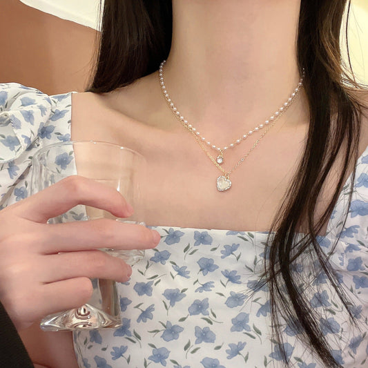 14K Gold Plated Zircon Pearl Double-Layer Heart Necklaces