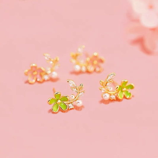 14K Gold-Plated Elegant Zircon Painted Flower Stud Earrings