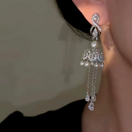 14K Gold-Plated Elegant Zircon Pearl Tassel Bell Earrings