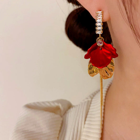 14K Gold-Plated Elegant Zircon Red Petal Earrings