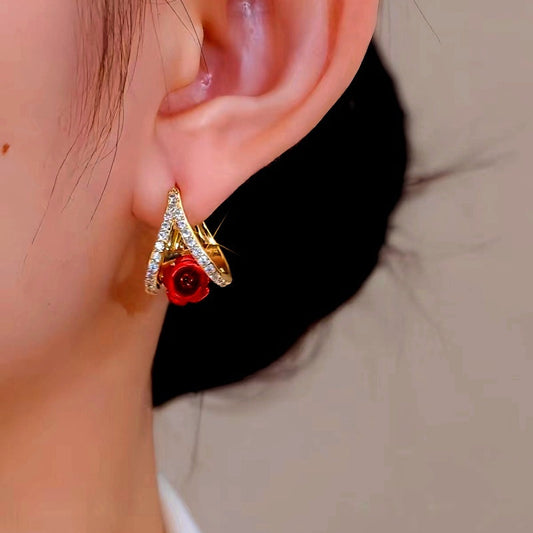 14K Gold-Plated Elegant Zircon Red Rose Earrings