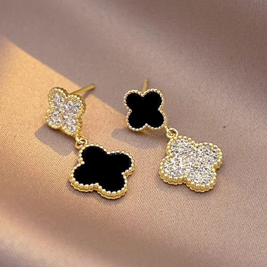 14K Gold-plated Diamond Four-Leaf Clover Black And White Earrings