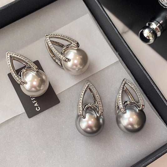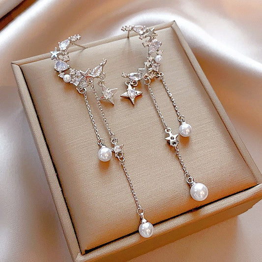 Silver Post Zircon Star Moon Pearl Earrings