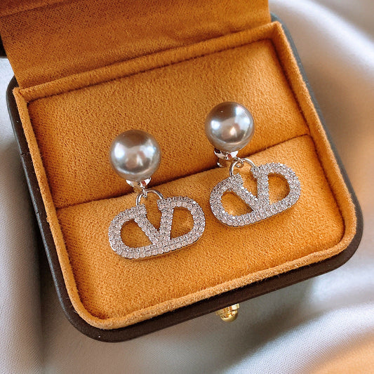 14K Gold-Plated Zircon Pearl V Letter Earrings