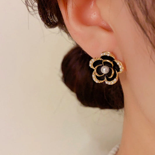 14K Gold-Plated Elegant Black Camellia Stud Earrings