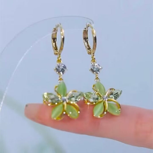 14K Gold-Plated Elegant Cat Eye Green Flower Earrings