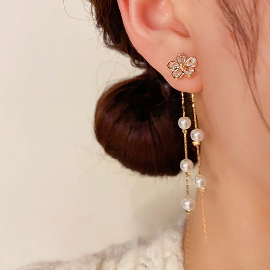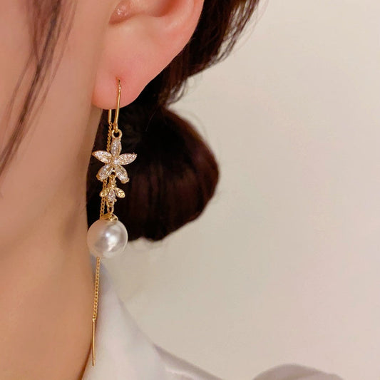 14K Gold-Plated Elegant Zircon Flower Pearl Threader Earrings