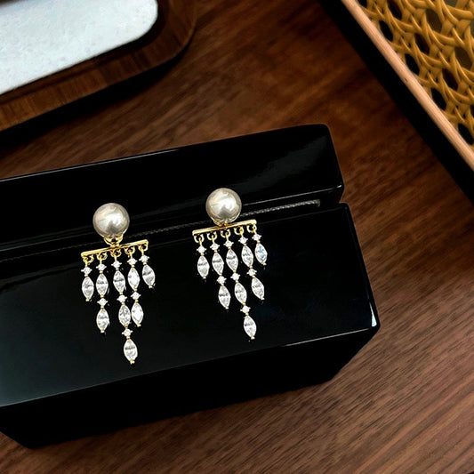 14K Gold-plated Pearl Zircon Tassel Earrings