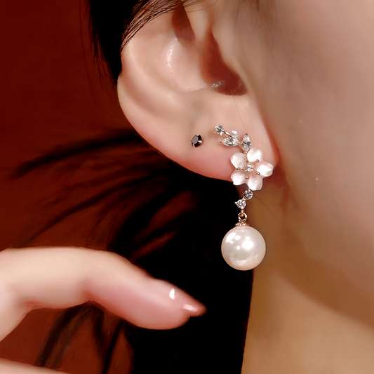 14K Gold-Plated Zircon Flower Pearl Earrings