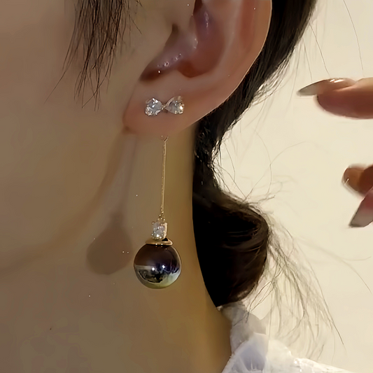 14K Gold-Plated Elegant Zircon Bow Black Pearl Tassel Earrings