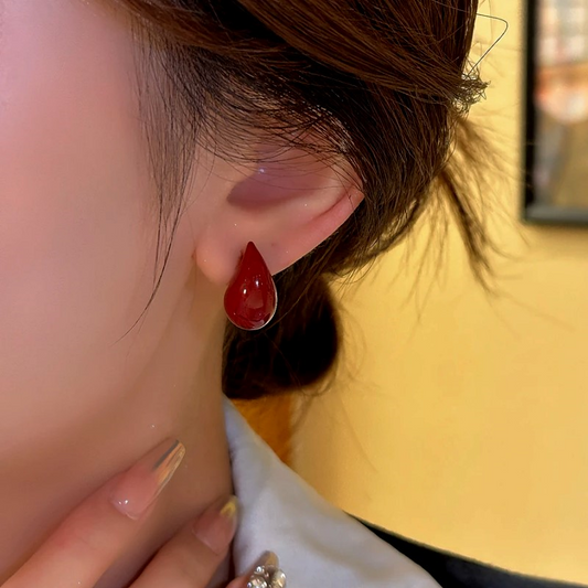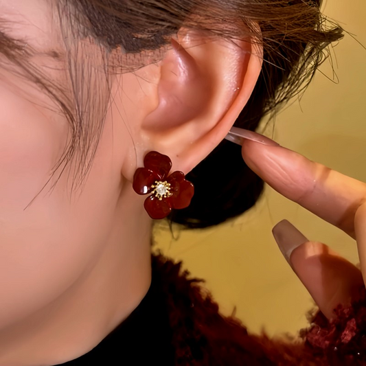 14K Gold-Plated Zircon Red Glaze Flower Stud Earrings