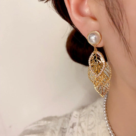 14k Gold-Plated Zircon Pearl Leaf Tassel Earrings