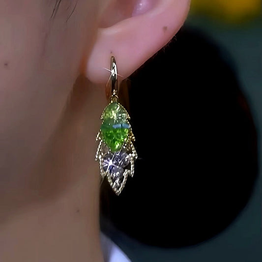 14K Gold-Plated Luxury Green Crushed Diamond Gradient Leaf Earrings