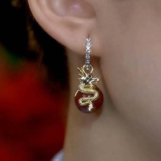14K Gold-Plated Zircon Dragon Pearl Earrings