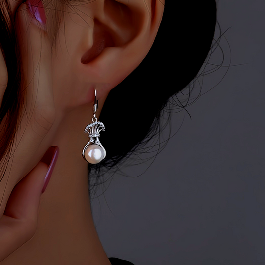 Sterling Silver Diamond Lucky Bag Pearl Ear Hooks