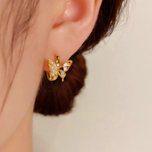 14K Gold-plated Zircon Butterfly And Pearl Earrings