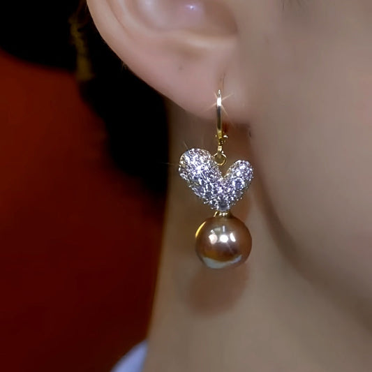 14K Gold-Plated Diamond Heart Brown Pearl Earrings
